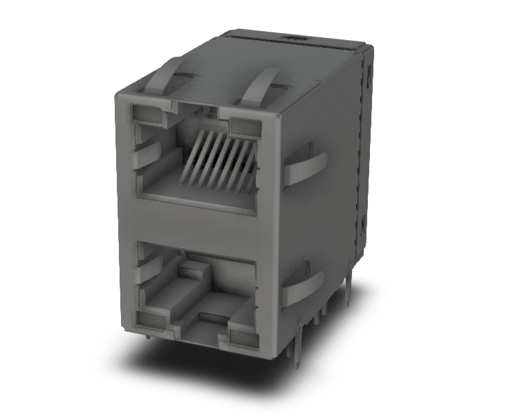Connector RJ45, Modular Jack with Giga magnetics, colour Black, configuration 1×2, Shield with EMI Fingers, Leds Green / Yellow, 30 uinch Gold plating
