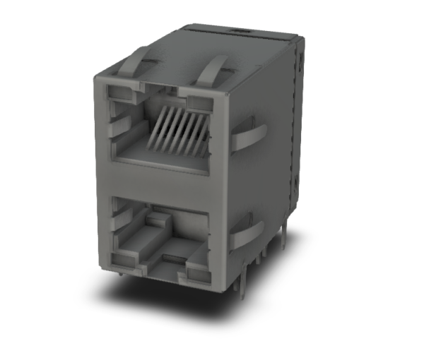 Connector RJ45, Modular Jack with Giga magnetics, colour Black, configuration 1×2, Shield with EMI Fingers, Leds Yellow / Green, 6 uinch Gold plating